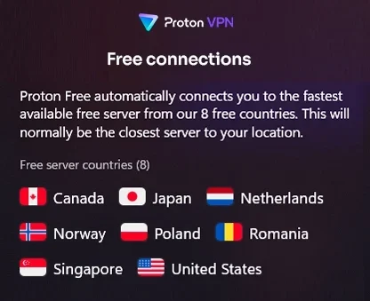 Es de código abierto, cuenta con una estricta política de no registro y tiene su sede en Suiza, un país reconocido por sus sólidas leyes de privacidad. La versión gratuita de Proton VPN te conectará automáticamente al servidor más rápido disponible en uno de los 8 países disponibles.